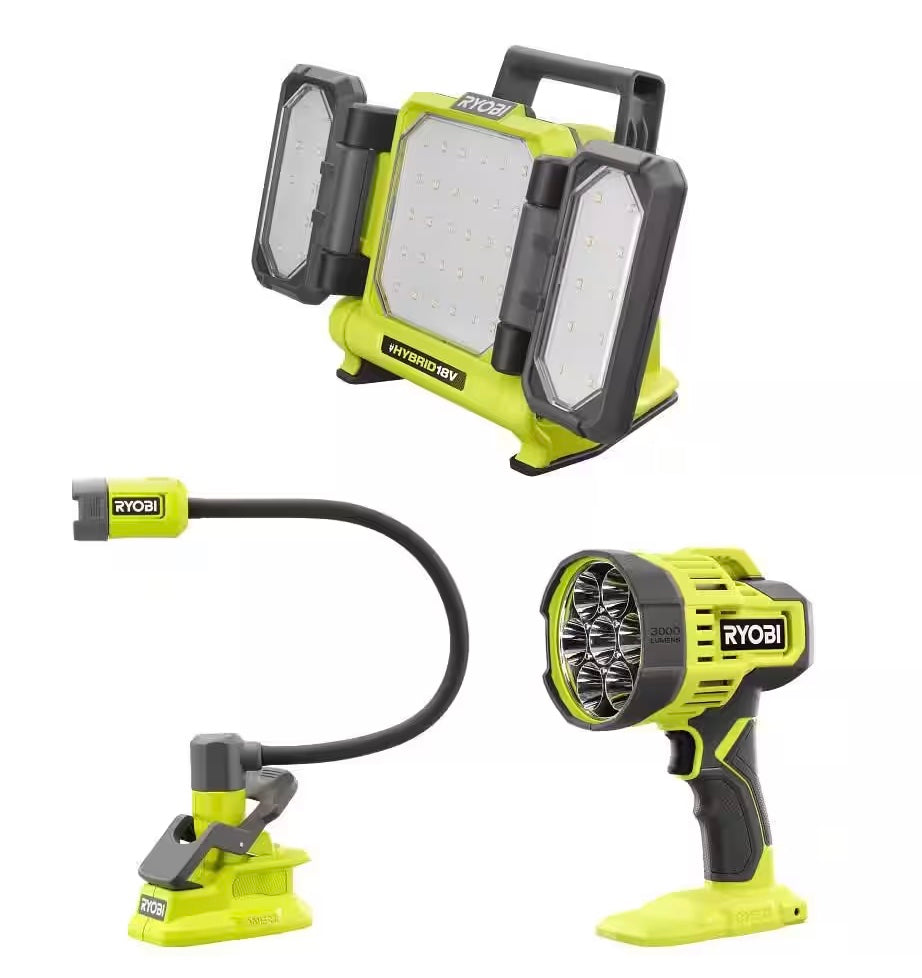 The RYOBI 18V ONE+ 3-Tool Lighting Combo is the perfect all in one lighting solution for any task or environment. The Hybrid LED Panel light utilizes hybrid technology to allow the use of any 18V ONE+ RYOBI battery or extension cord. It has up to 3,000 lumens with 360° rotating side panels and a 150° pivoting front panel. The LED Spotlight has 3,000 lumens reaching a beam distance of 650 yard beam distance and also incorporates a hanging loop for convenient storage. The LED Flexible Clamp light has up to 400 lumens of flood and up to 200 lumens of spot light output making it perfect for any size project. With a 1-3/4" clamping capacity, 16" flexible neck and rotating base, this light offers maximum adjustability and precise lighting placement. Part of the RYOBI ONE+ System - Any 18V ONE+ Battery Works with any 18V ONE+ Product. This 18V ONE+ 3-Tool Lighting Combo includes PCL631 18V ONE+ Hybrid LED Panel Light, PCL661 18V LED Spotlight, PCL665 18V LED Flexible Clamp Light and Operator's Manual. Battery and charger sold separately.