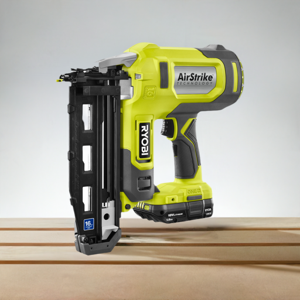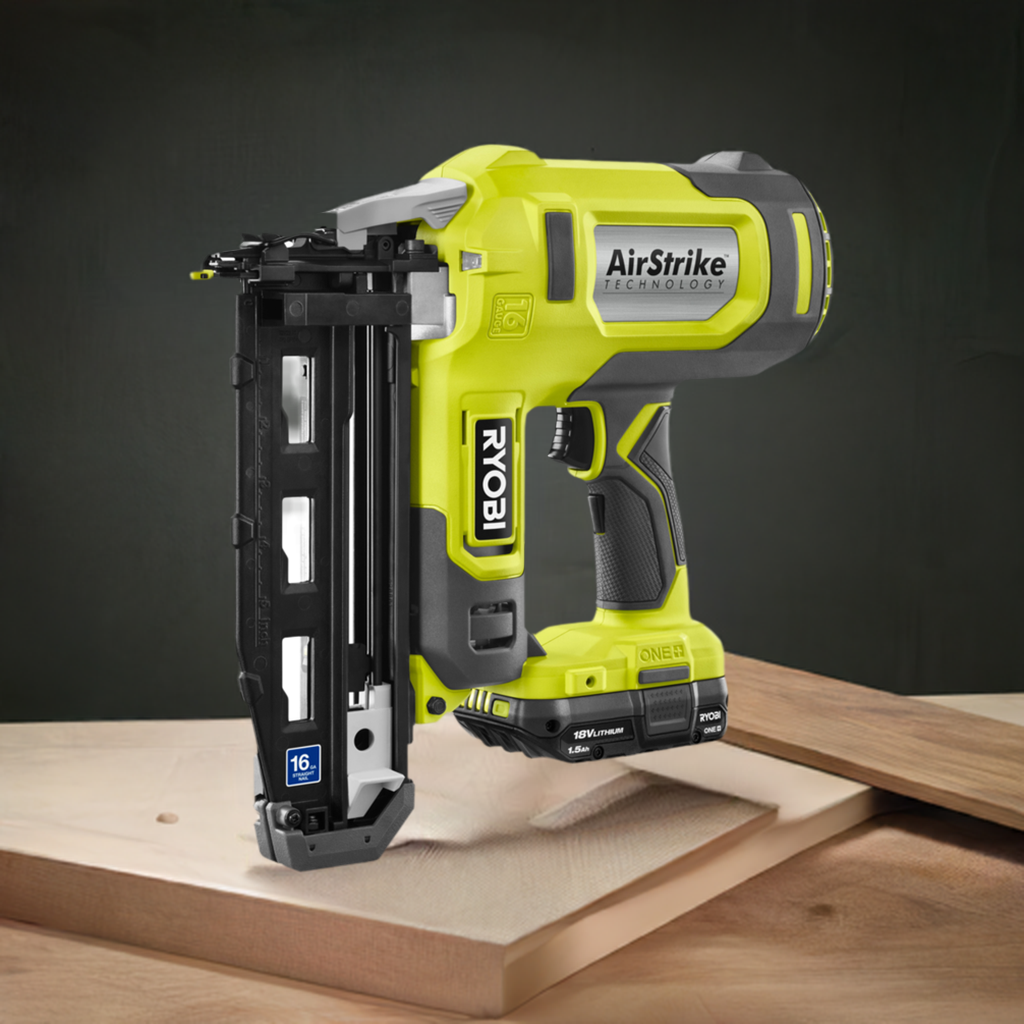 RYOBI introduces the 18V ONE+ 16-Gauge Cordless AirStrike Finish Nailer. This Finish Nailer features AirStrike Technology, which eliminates the need for noisy compressors, bulky hoses, or expensive gas cartridges. This means faster setup and easy maneuverability on the job site. This Straight Finish Nailer is capable of sinking up to 2-1/2 in. nails in hardwoods. The tool-free depth of drive adjustment allows for proper setting of nail heads. This nailer allows for extended periods of continuous work by sinking up to 1,000 nails per charge. It additionally offers a 78% smaller nose for tight spot access and superior drive quality, compared to P325. There is also a convenient adjustment dial to regulate air pressure speed for optimal performance. Great for crown molding, baseboard and exterior trim, this Finish Nailer is the perfect addition to any carpenter or DIYer's tool collection.