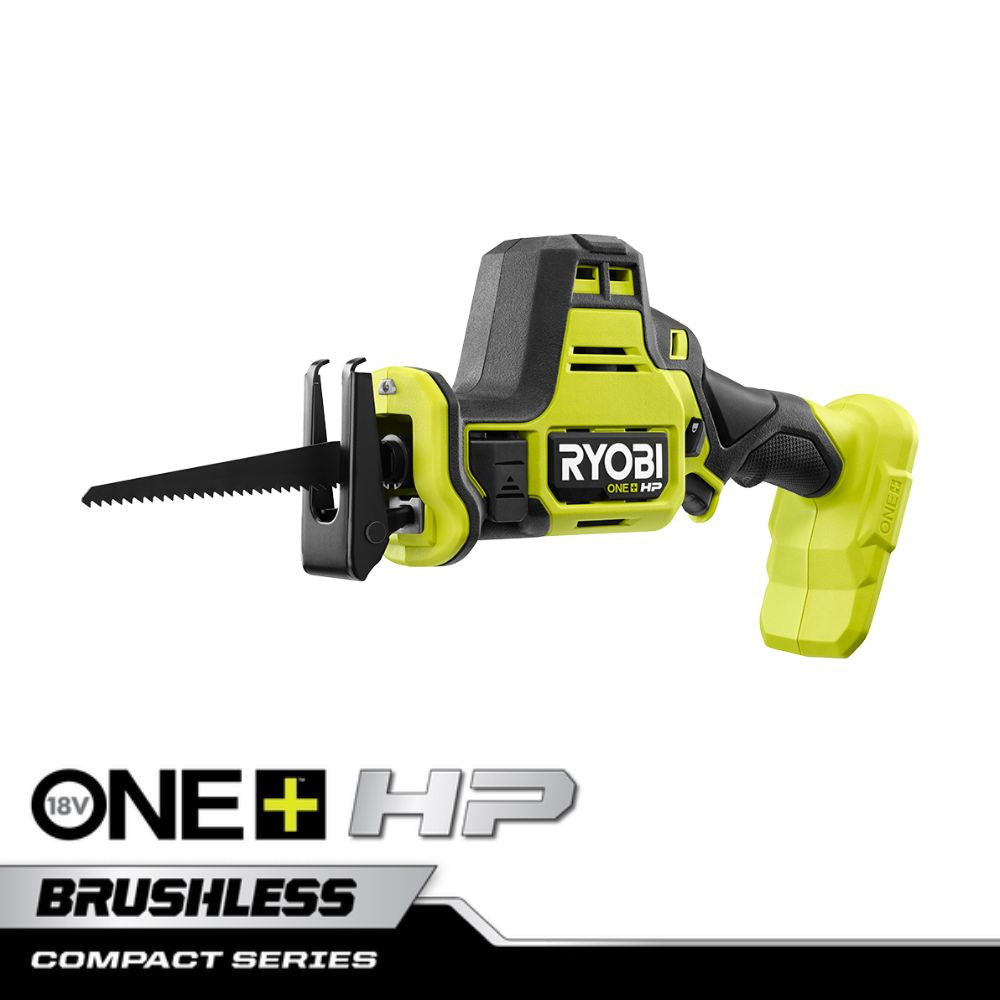 RYOBI introduces the ONE+ HP 18V Compact Brushless One-Handed Reciprocating Saw (Tool Only). This Recip Saw is our most compact reciprocating saw to date-just 13 in. in length to be exact. Being 31% more compact and 24% lighter weight than the brushed version, this saw is ideal for cutting in tight spaces and completing overhead applications without strain. The brushless motor delivers speeds of up to 3,000 SPM. That's one powerful tool wrapped up in a lightweight design. The pivoting shoe provides greater depth control to maximize blade efficiency and to minimize downtime. There is also an easy blade release lever to swap blades out quickly. The ONE+ HP 18V Compact Brushless One-Handed Recip Saw includes a 6 in. wood cutting blade and an operator's manual. Batteries and chargers are sold separately.