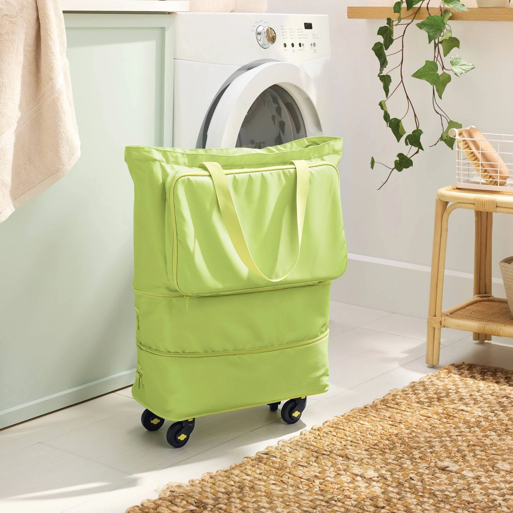 Keep your home clutter-free with the help of this Collapsible Rolling Tote from Brightroom. Made of recycled polyester, this tote storage bag features a main compartment with zipper to store large items, and a side compartment to easily access frequently used items. Designed with spinner wheels for easy maneuverability, this 48-liter tote bag in a soot black hue is great for storing your bedding, clothes, shoes and more. Best of all, it's collapsible for easy storage when not in use. Brightroom: See your space in a new light.